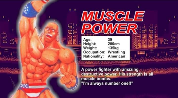 multiple belts. He also strongly believes his own power of his muscles is #1. He fights in the World Heroes tournament to prove it. He dreams of making a name for himself in the pro wrestling world. Muscle Power is a super charismatic wrestler who believes his muscles are the best weapon this world has yet to see.